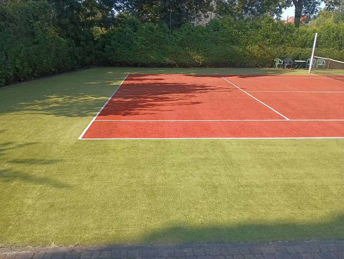 czysty kort tenisowy po myciu – odświeżona nawierzchnia ze sztucznej trawy