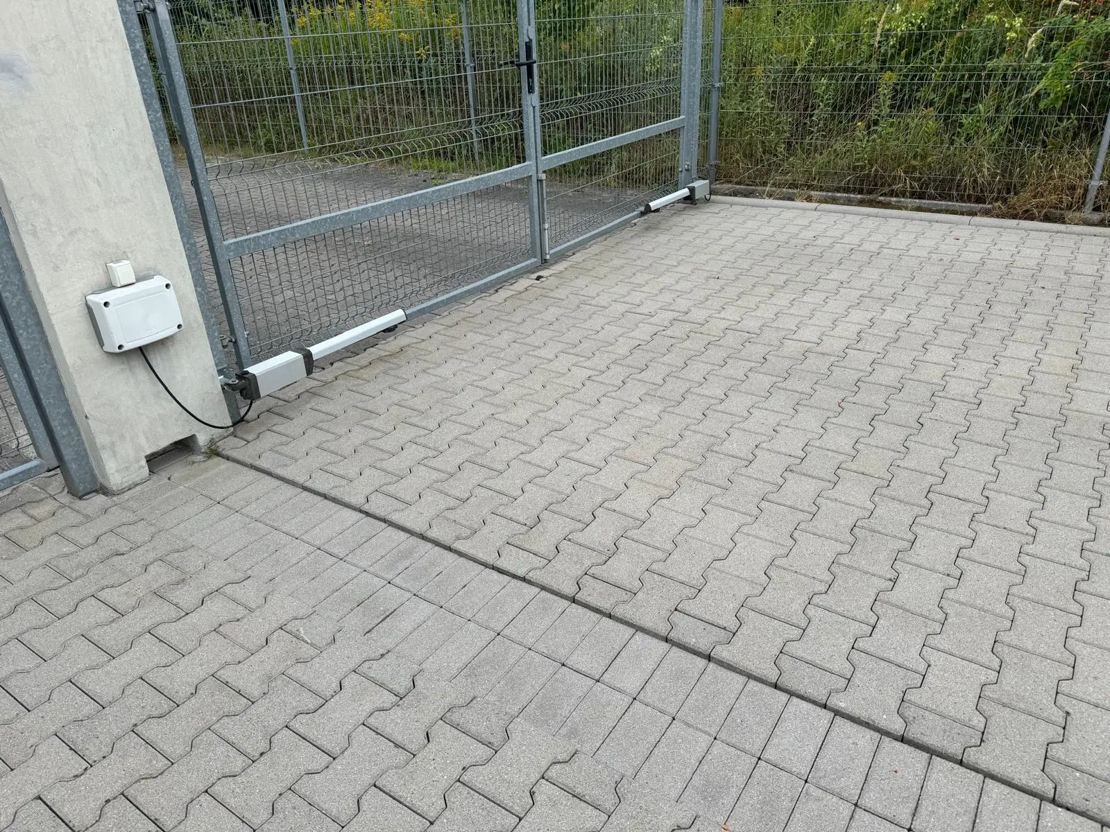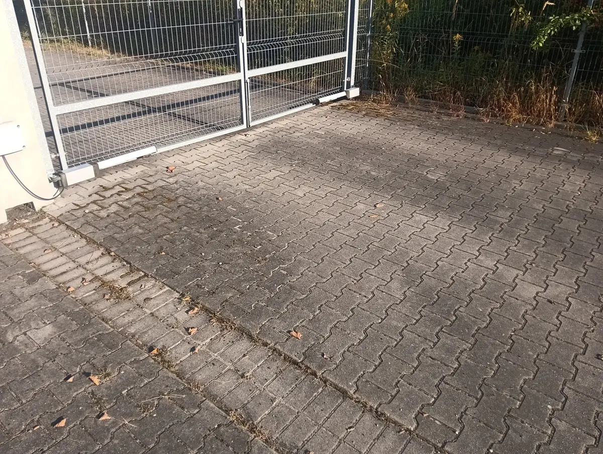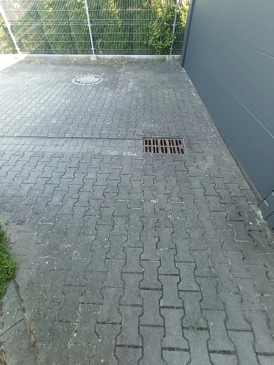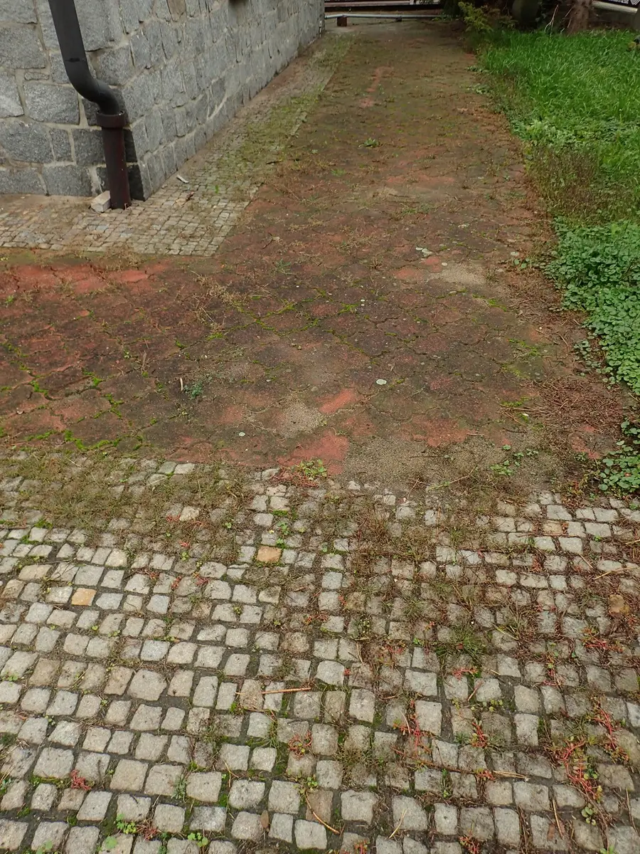 zabrudzona kostka brukowa przed myciem – osady i naloty przy bramie wjazdowej