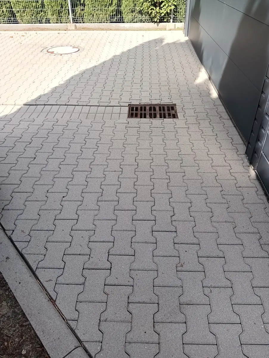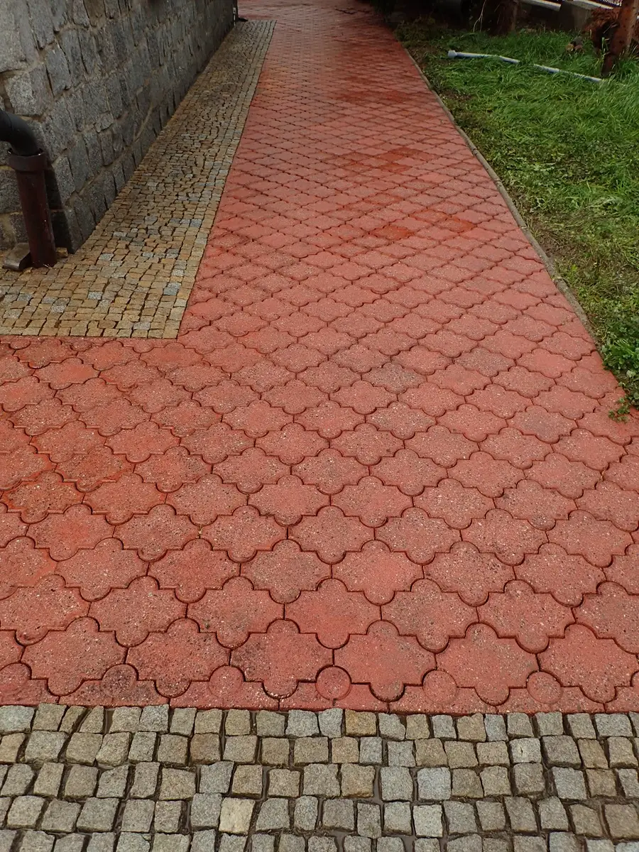 czysta kostka brukowa po myciu ciśnieniowym – odświeżona nawierzchnia przy budynku