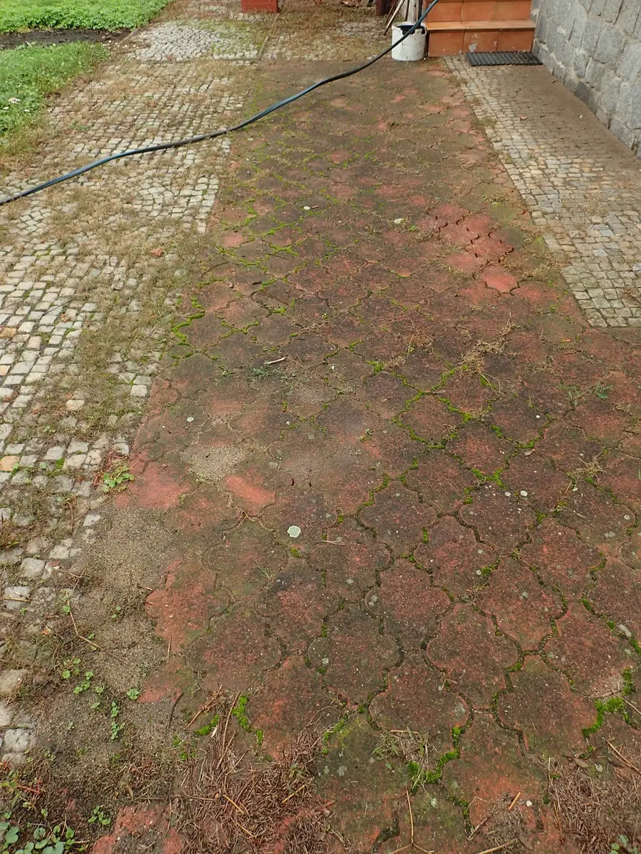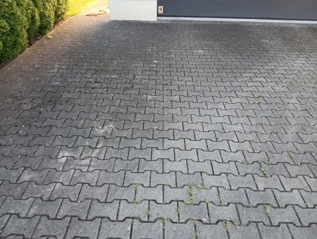 zabrudzona kostka brukowa na podjeździe – nawierzchnia przed czyszczeniem