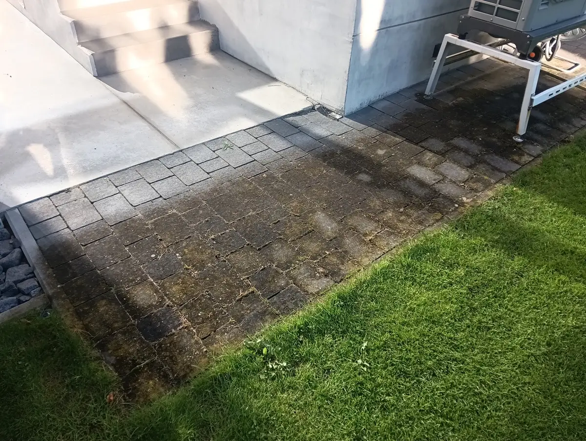 zabrudzona kostka brukowa przy wejściu na taras – powierzchnia przed czyszczeniem