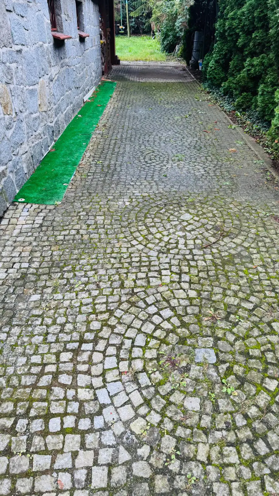 podjazd z kostki brukowej przed czyszczeniem – widoczne zabrudzenia i zielone naloty