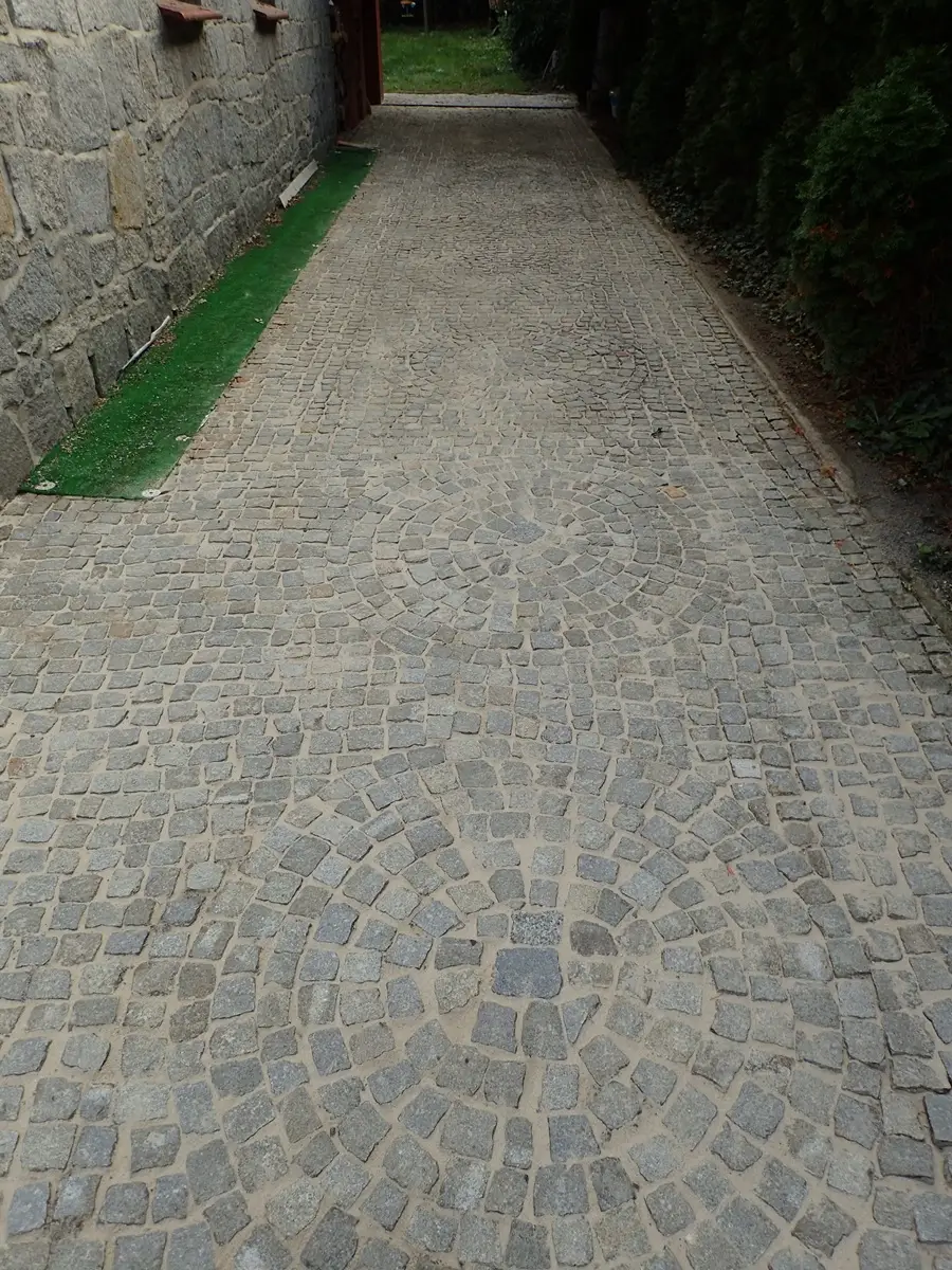zabrudzona kostka granitowa na ścieżce – powierzchnia przed myciem ciśnieniowym