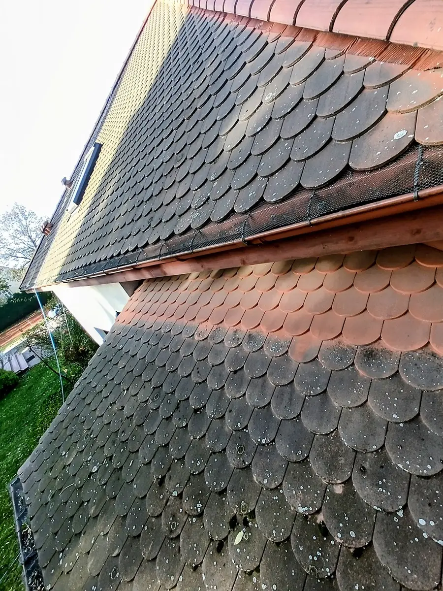 dach w trakcie mycia ciśnieniowego – widoczny efekt przed i po czyszczeniu połaci